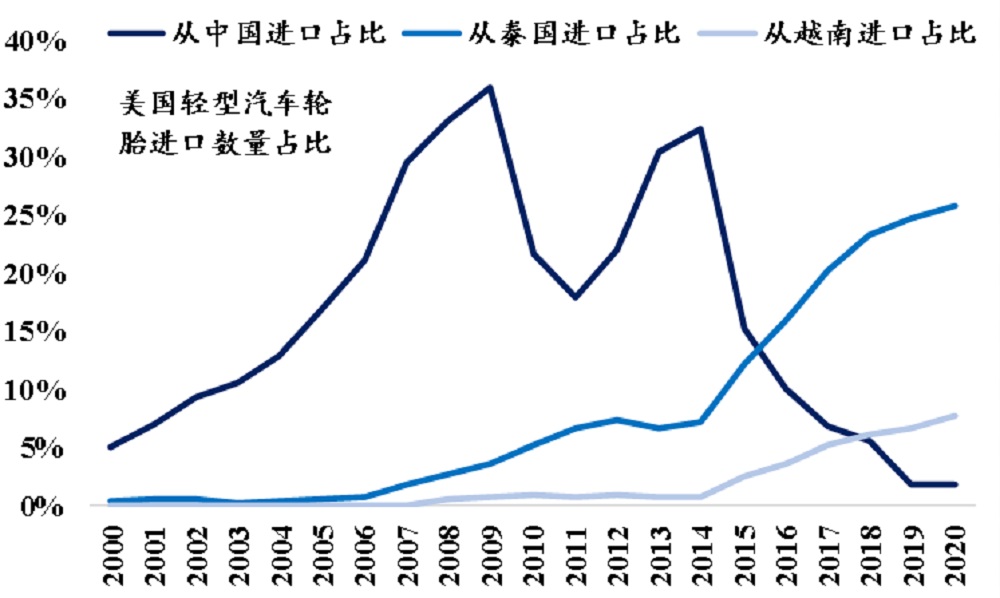 从近年来美国进口轮胎的数据也可以看出,自2013年以来,从中国进口轮胎断崖式下跌,从泰国、越南进口轮胎快速上升。