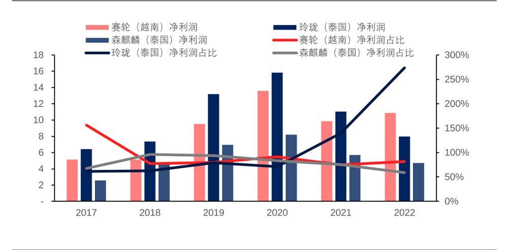 从下图玲珑、赛轮、森麒麟三家轮胎是的在海外工商的净利润可以看出,赛轮越南工厂净利润占集团全部利润的70%以上,森麒麟达到50%以上,而玲珑轮胎则超过了250%,也就是要靠海外工厂利润来填补国内亏损。