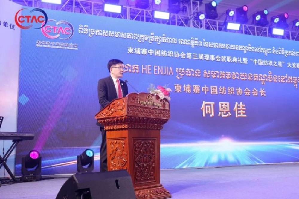 庆典活动在柬埔寨风情“祝福舞”中拉开序幕。首先上台发言是东道主,柬埔寨中国纺织协会何恩佳会长。何会长首先感谢一直以来支持协会的各界人士,回顾了成立协会以后协会的发展,表达了愿为最大投资商的中资纺织企业将为柬埔寨纺织工业的发展作出更大的努力,助力柬埔寨发展发展上游产业的意愿,帮助柬埔寨纺织行业的可持续性发展,并对为柬埔寨纺织行业作出贡献的中国管理人员作出了肯定、感谢和鼓励,祝贺当选为首届柬埔寨纺织之星大奖赛获奖的中国管理人员,为中柬友谊作出更大的贡献。