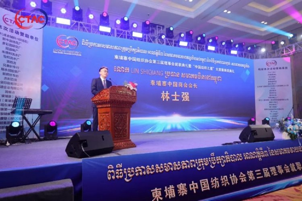柬埔寨中国商会林士强会长致辞指出纺织协会是中国商会构建的三大板块之一,是中资企业在柬投资的中坚力量,并用具体数据阐述了纺织协会在柬埔寨出口的龙头地位,充分肯定了纺织协会在柬埔寨改善民生,培训技术工人,提供就业,助力柬埔寨经济繁荣,做出的突出贡献。