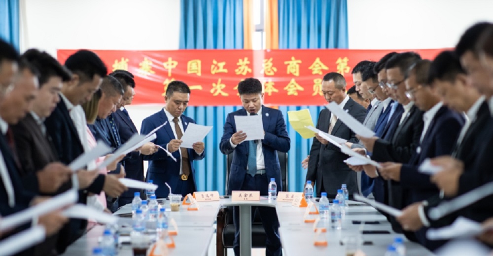 会议期间,柬埔寨中国江苏总商会全体会员在吴金艮会长带领下郑重宣誓:我将忠实履行我的职责,恪守组织章程,秉持组织共信,共建,共享,共赢宗旨,积极参与江苏总商会的各项活动和项目,勇于担当,团结会员,凝聚共识,共同为柬埔寨中国江苏总商会的发展和繁荣而努力奋斗!据柬埔寨投资促进网了解:柬埔寨江苏总商会有约80家会员单位,投资领域涉及房地产、医疗、工业园、酒店、矿产、制衣、工程、餐饮等。