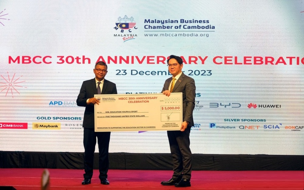 近日、柬埔寨马来西亚商会(MBCC)在金界娱乐城1宴会厅举行举行庆祝成立30周年晚宴,众多国家领导人、各国商会代表、马国企业和会员出席,共襄盛举。副总理兼教育部长洪尊那隆代表洪玛耐总理担任晚宴主宾,其他嘉宾包括马来西亚驻柬埔寨大使埃尔丁胡赛尼。在晚宴上,马来西亚商会也向教育部教育基金捐献5千美元,由洪尊那隆副总理代表接收。