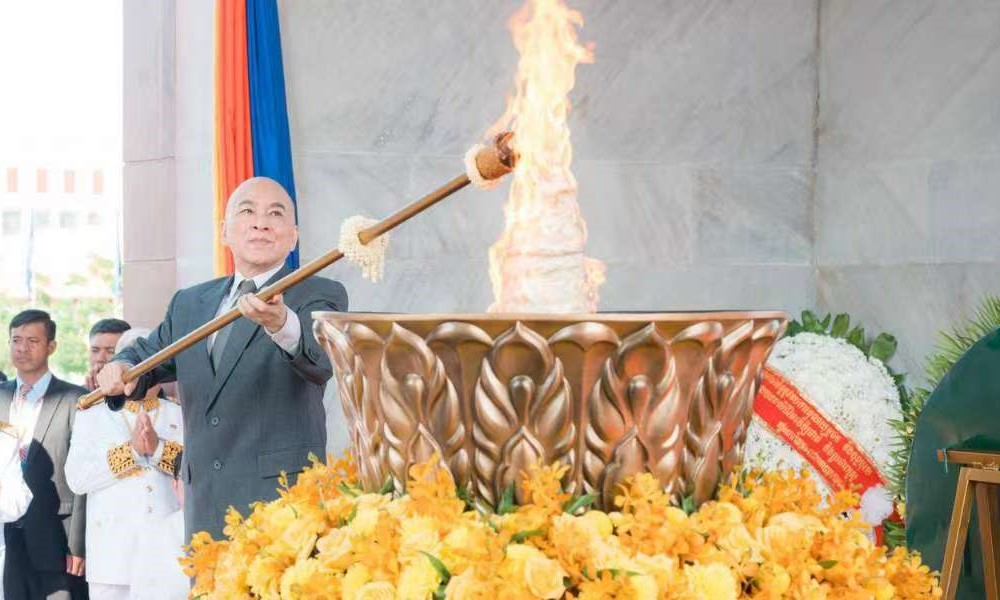 在庄严的仪式上,西哈莫尼国王陛下不仅点燃了“胜利之火”,还向独立纪念碑敬献了花圈,以此深切缅怀国家独立历程中付出努力的先辈们, 以此表达对国家独立历史和已故先辈的崇高敬意。