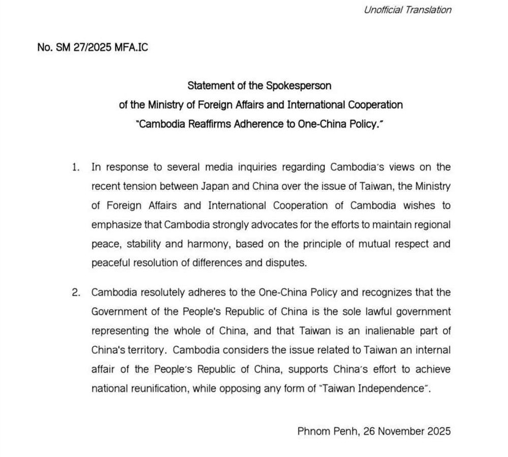 柬外交部重申,柬埔寨严格遵循“一个中国”原则,承认中华人民共和国政府是代表全中国的唯一合法政府。台湾问题属于中国内政,外部势力无权干涉。柬方坚定支持中国实现国家统一的努力,反对任何形式的“台独”分裂活动。
