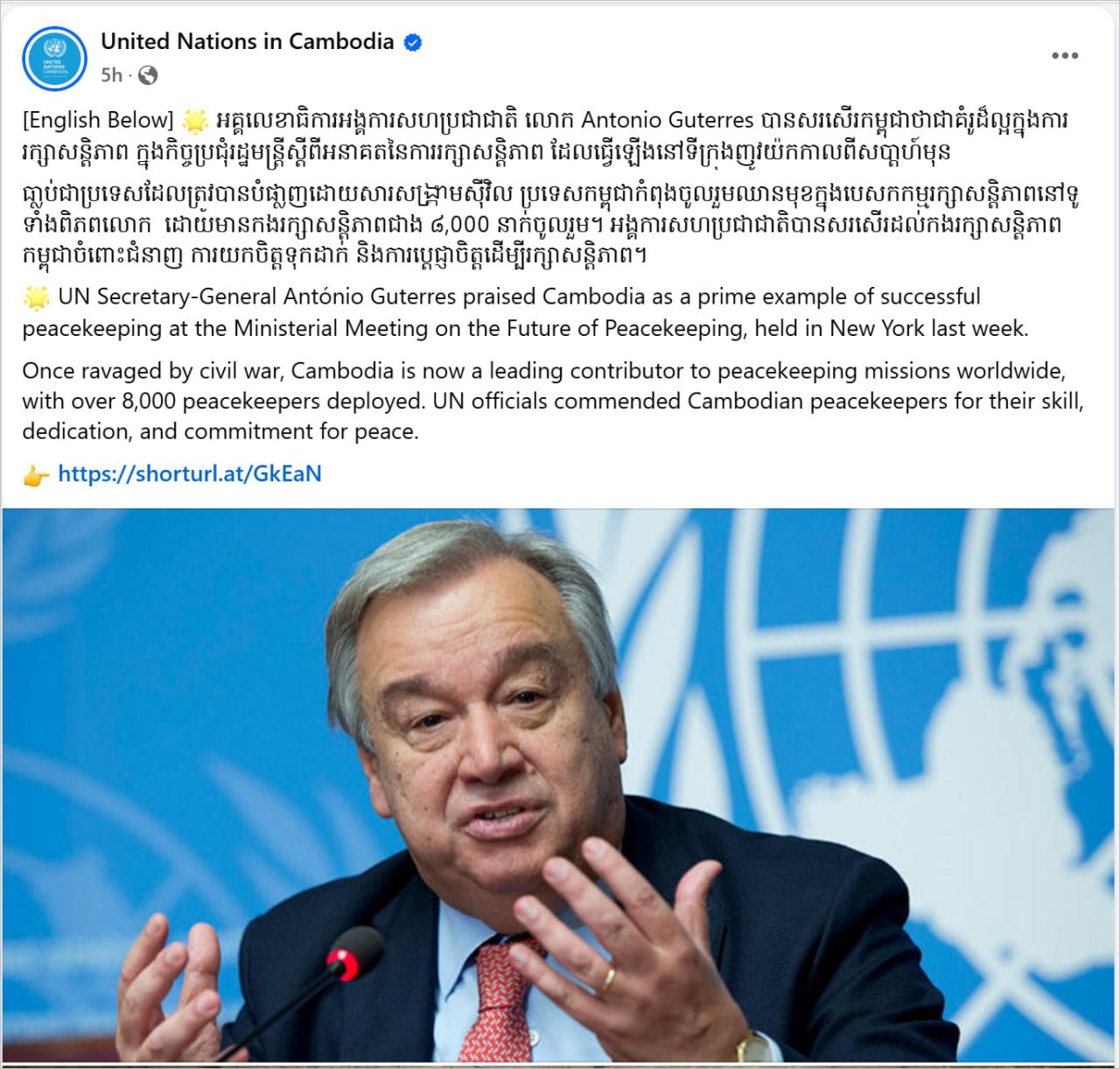 2025年5月23日,联合国驻柬埔寨官方社交媒体发布消息称,联合国秘书长安东尼奥•古特雷斯(Antonio Guterres)在联合国和平行动部长级会议期间高度评价了柬埔寨,称其为“在维护和平方面的杰出典范国家”。