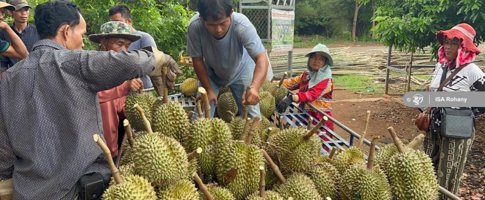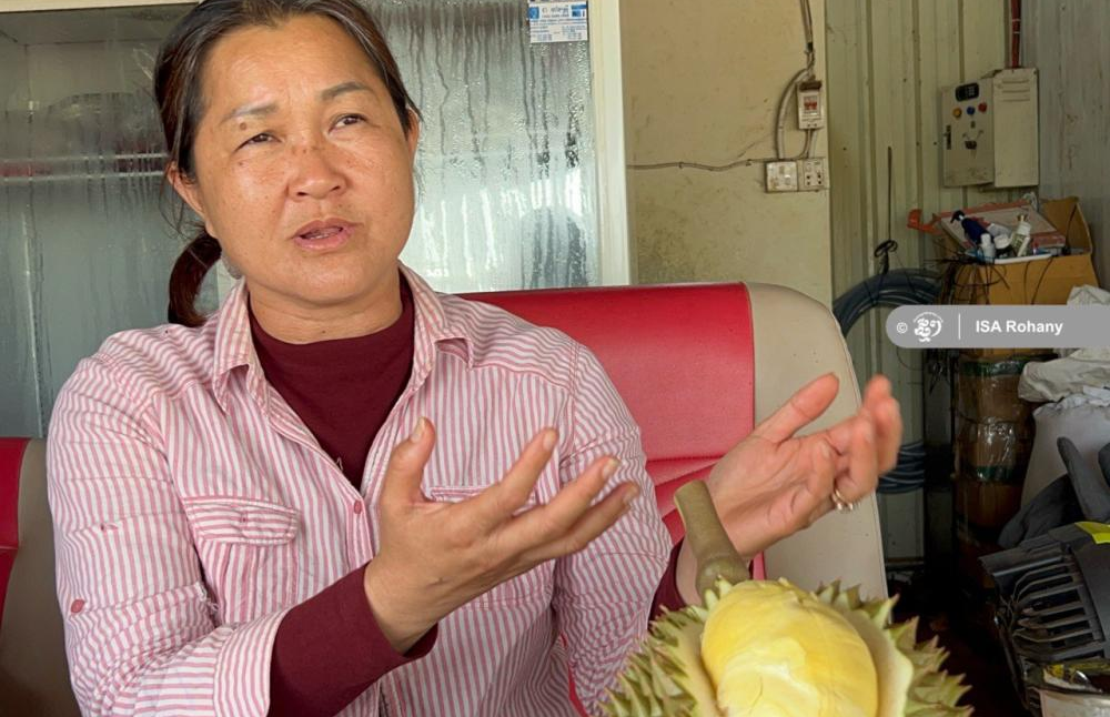 她在哈芷山拥有23公顷榴莲农场,并与本地多户果农签署合作协议,确保货源稳定。为保障公平交易,她统一定价,无论批发零售、数量多少,一律每公斤15,000瑞尔。依托良好品质与诚信经营,日均销量达到15至20吨,销售团队几乎“全天在线”。