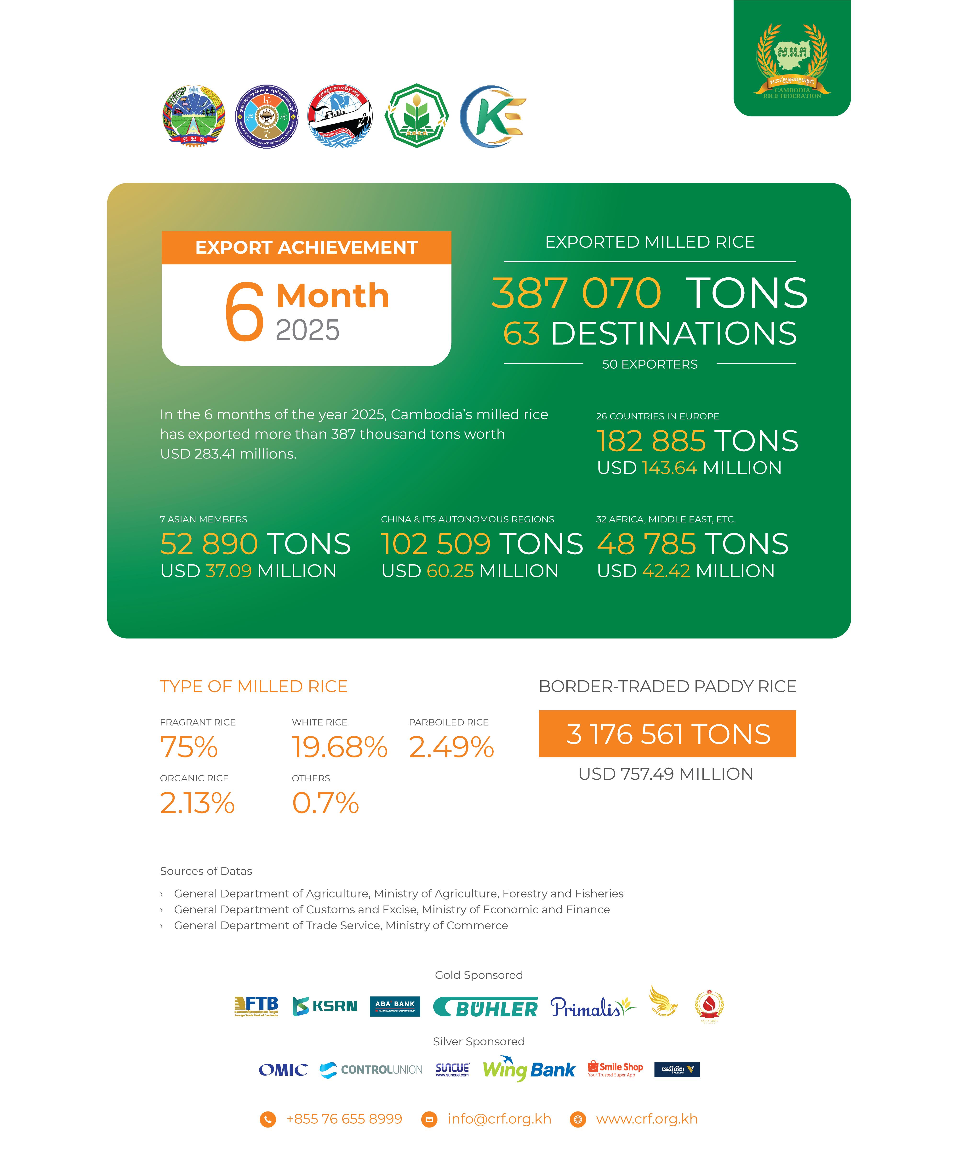 柬埔寨稻米联盟(CRF)最新发布的数据报告显示,2025年1月至6月,柬埔寨大米出口表现强劲,累计出口量达到38万7070吨,出口收入达2.83亿美元。