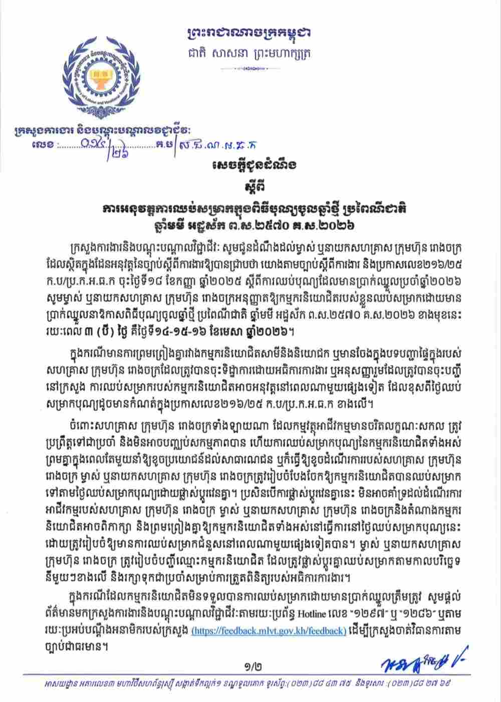 柬埔寨劳工部官宣:2026 柬新年享三天带薪假期